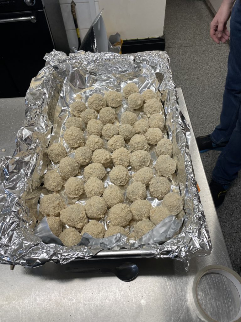 The day started early with over 140 suppers being prepared by our helpers. Over 450 individual haggis bonbons had been prepared for our Burns Tapas meal