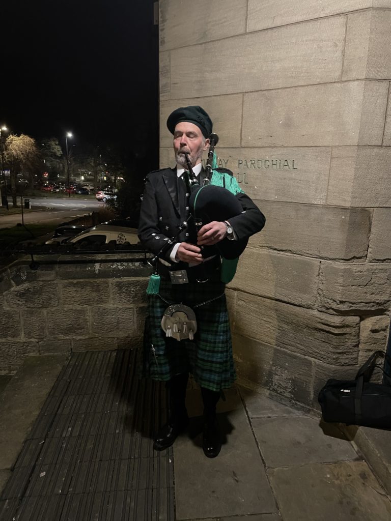 Our hosts for the night , Mike Kirk who gave the Selkirk Grace, Dirk Cuthbertson before his Address to the Haggis, the night’s main organiser, Dave Tierney and finally our piper for the night Seamus Corr